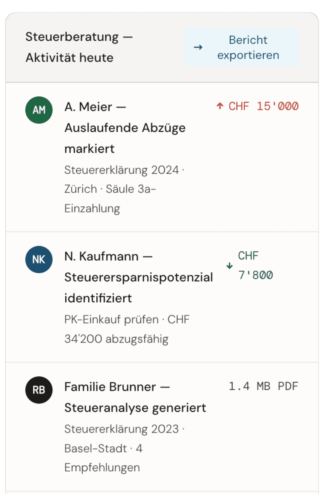 Laden Sie jede Schweizer Steuererklärung als PDF hoch, aus jedem Kanton, jeder Behörde. Unser System liest, extrahiert und strukturiert die Daten ohne manuelle Eingabe
