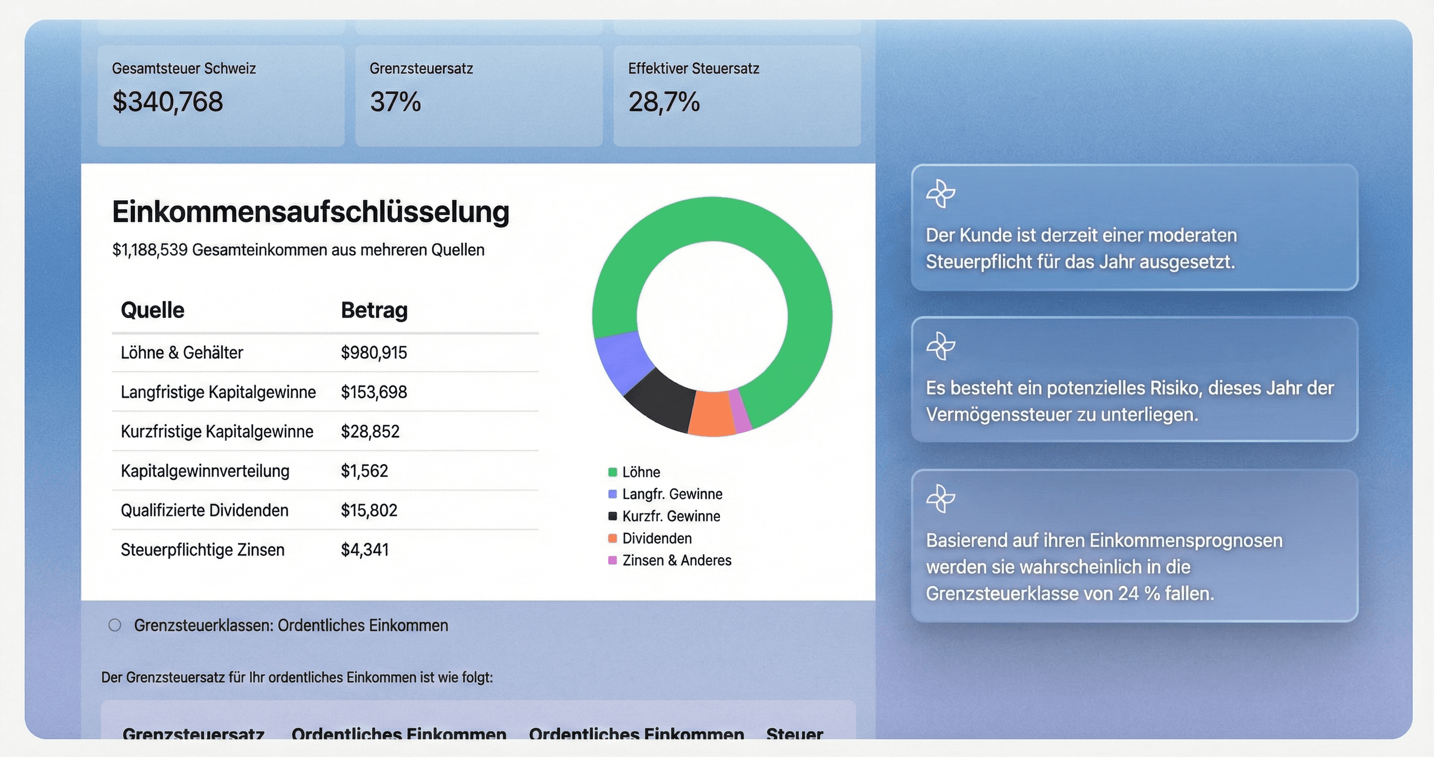Vergleichen Sie Steuerbelastungen bei einem Wohnortswechsel zwischen Kantonen. Simulieren Sie Kapitalgewinnereignisse. Zeigen Sie Mandanten konkrete Auswirkungen, mit Zahlen, nicht mit Annahmen.